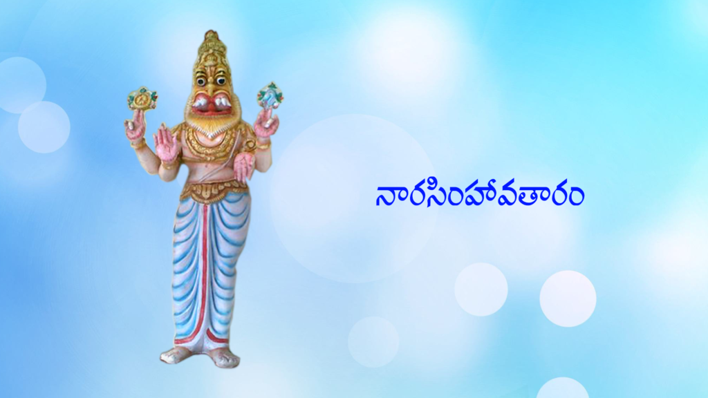 హిరణ్యకశపుడు   స్తంభాన్ని పగలగొడతాడు , స్తంభం లో నుండి నారసింహావతారం లో వచ్చి హిరణ్యకశపుడిని చంపుతాడు.